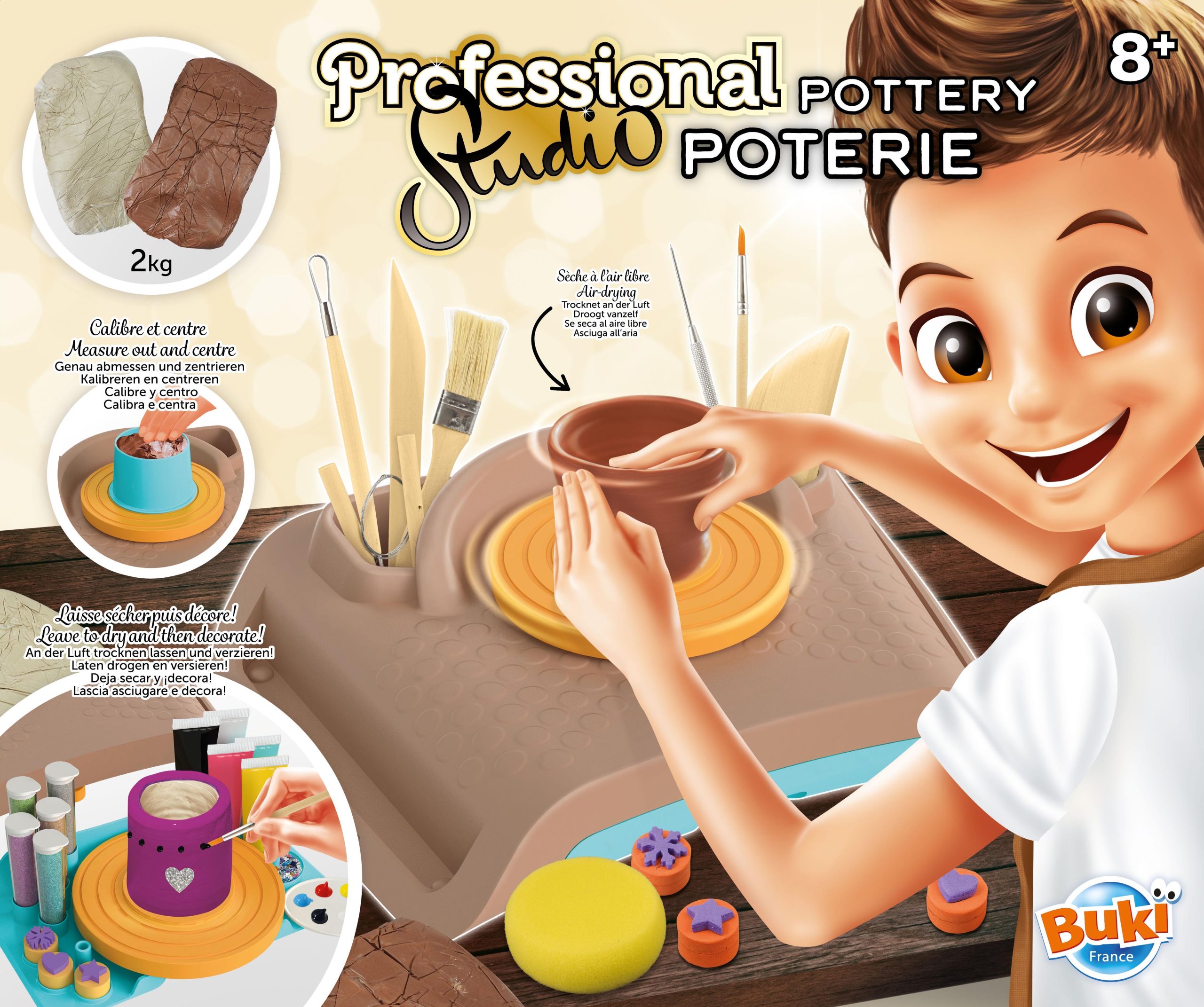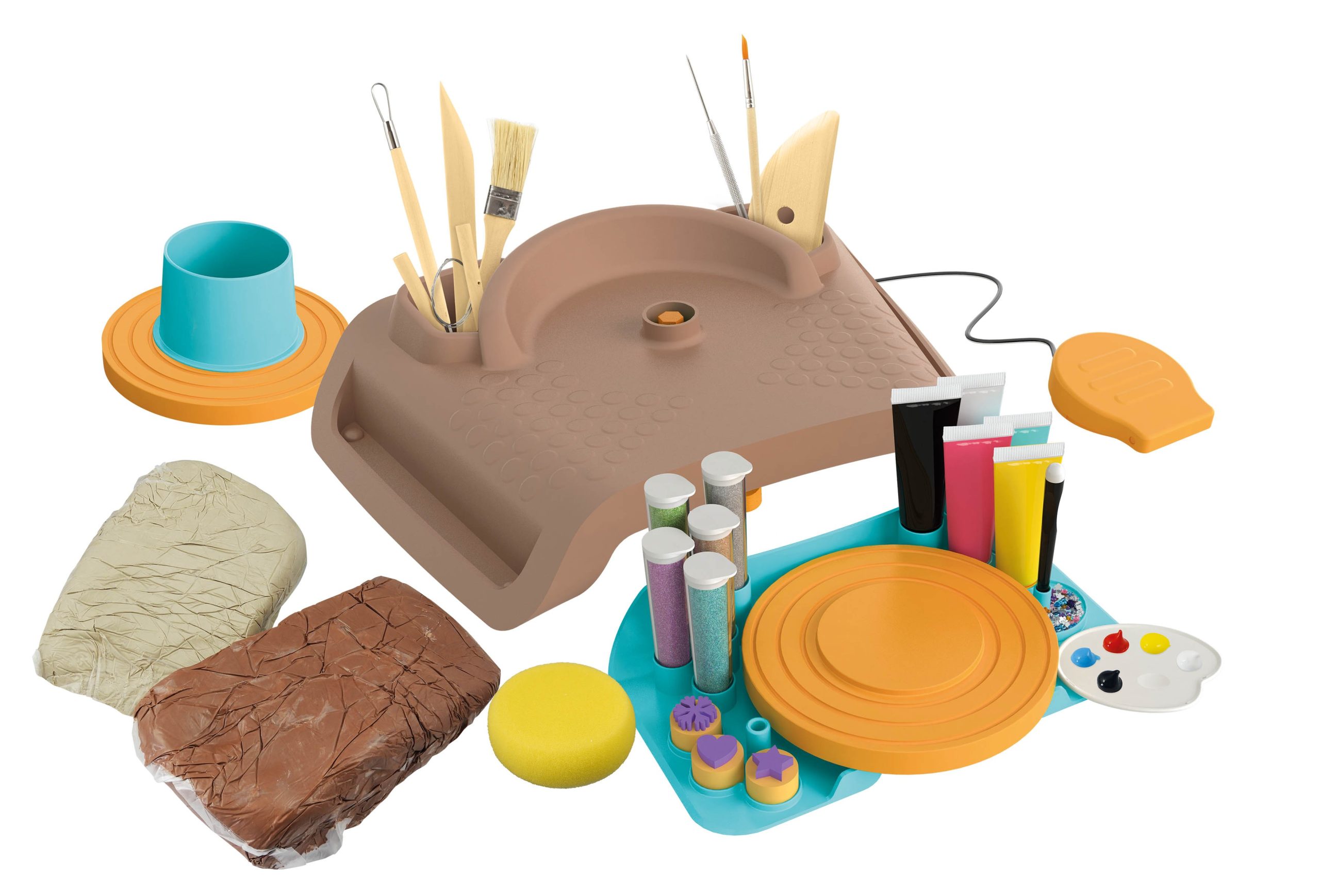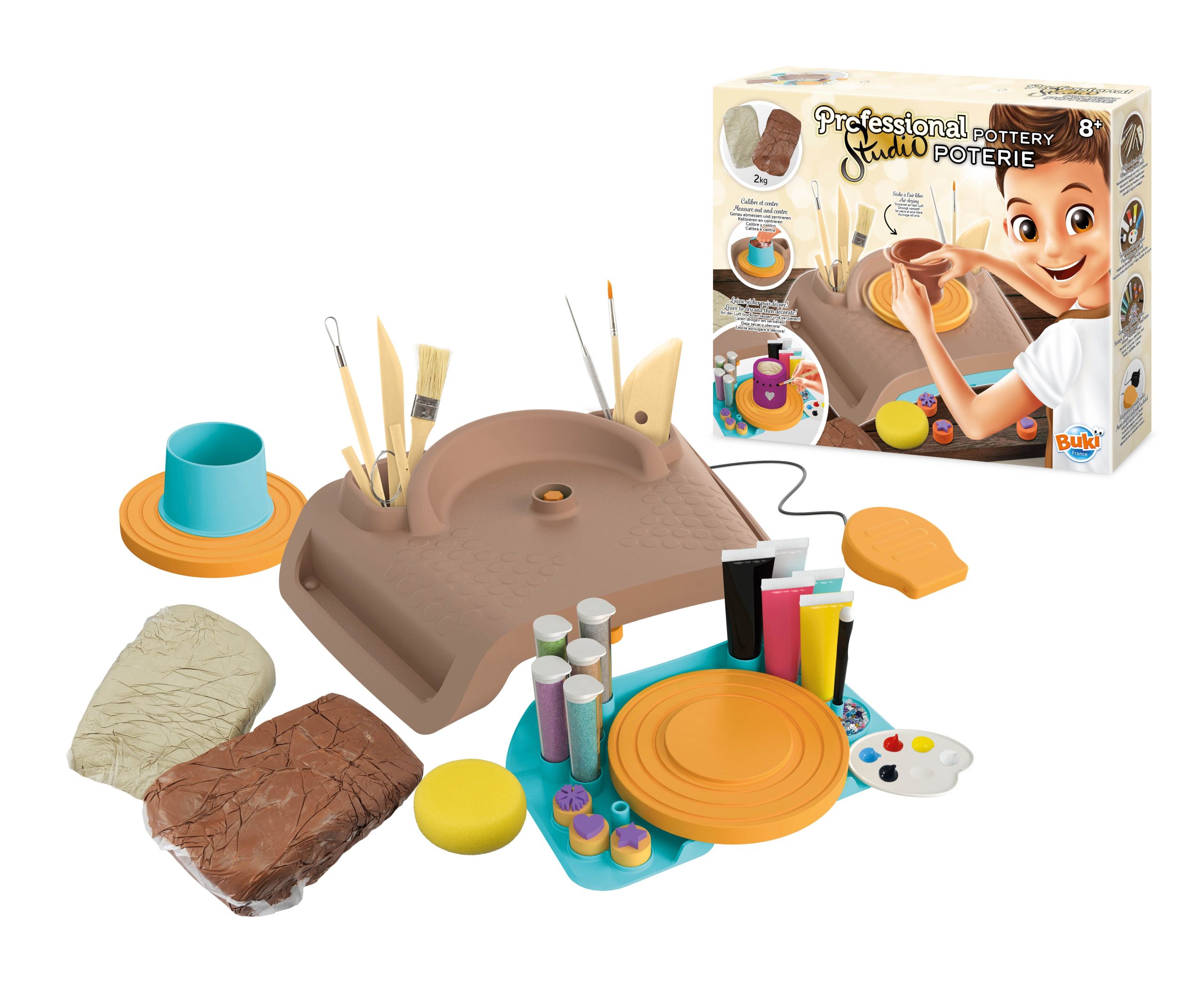 Ένας πραγματικός τροχός αγγειοπλαστικής, ειδικά σχεδιασμένο για παιδιά. Μάθετε πως να φτιαχνετε και να διακοσμέιτε αντικειμενα. Περιλαμβάνει 2 κιλά πηλό,ένα ανοιχτόχρωμο και ένα καφε. Κατά το στέγνωμα το στουντιο μπορει να πλυθει με ασφαλεια καθώς εχει αφαιρουμενο ηλεκτρικο κινητηρα. Πειλαμβάνονται 2 κιλά πηλό,ξυλινα & μεταλλικα εργαλεια,2 βουρτσες,σωληνες βαφης κλπ.Ηλικία 8+