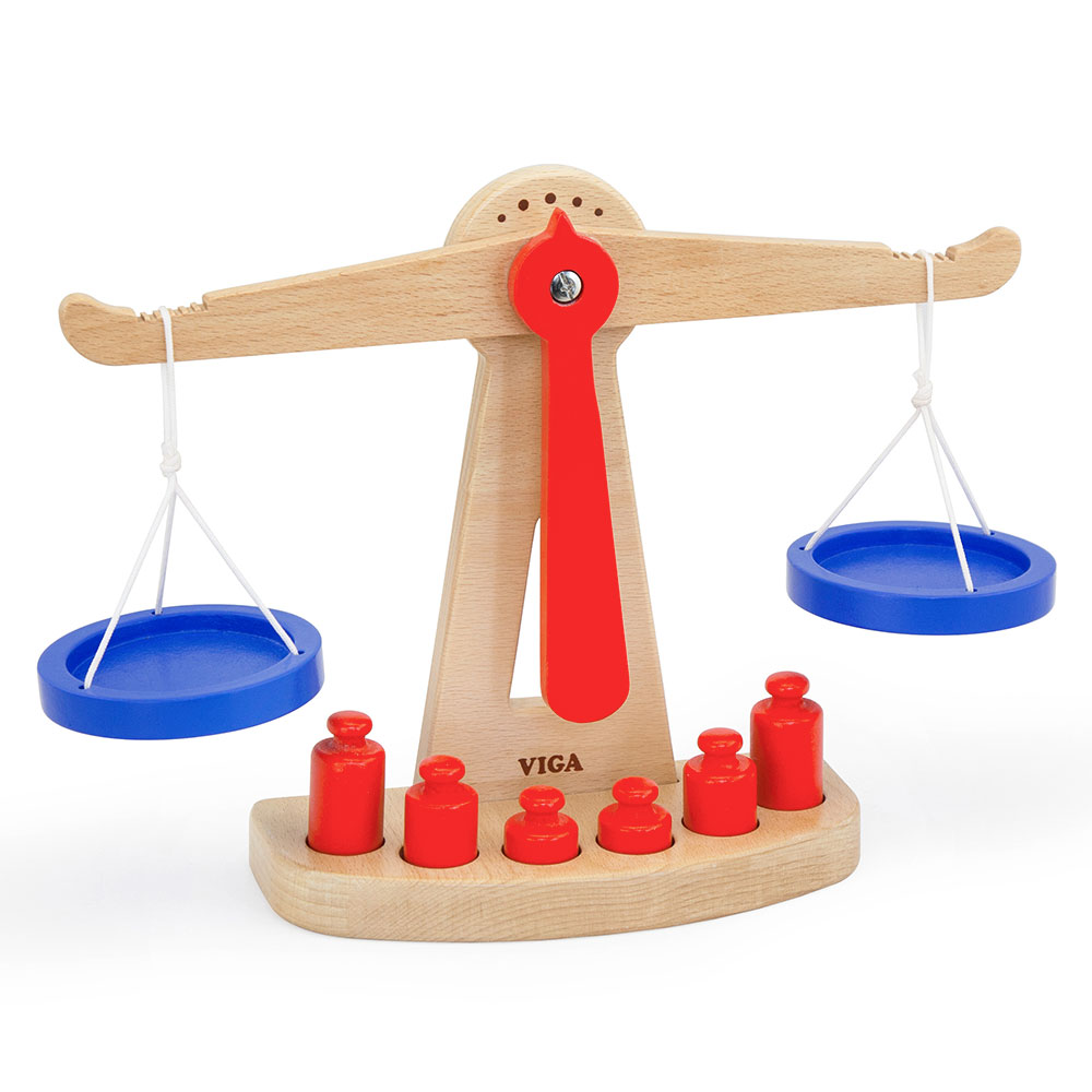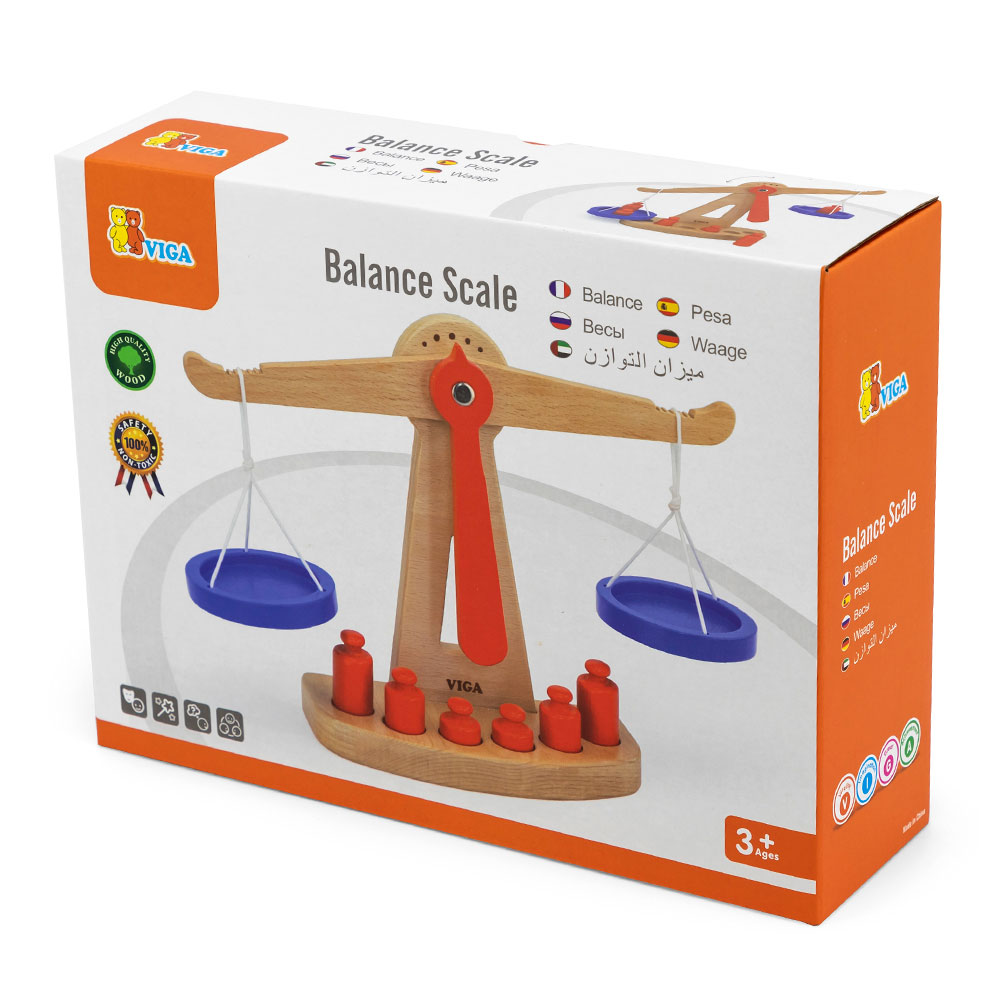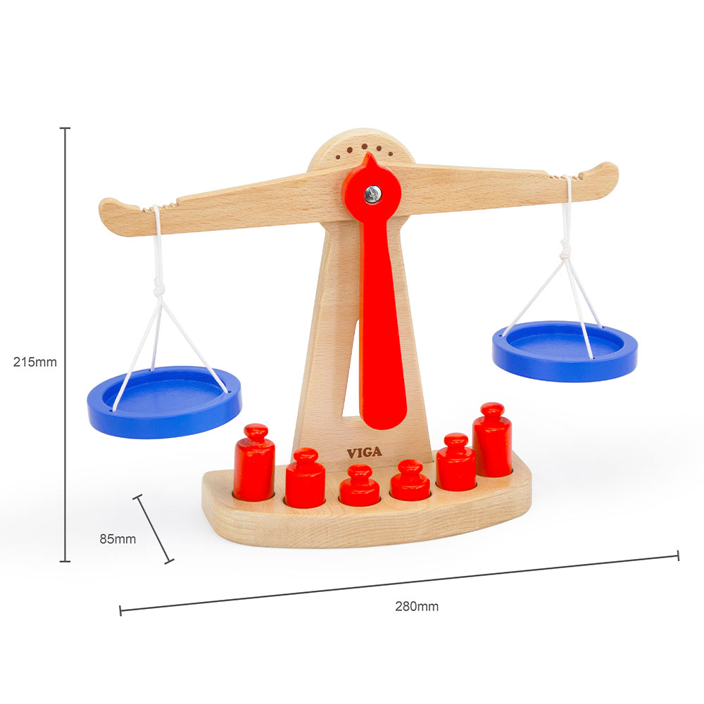 Ξύλινη ζυγαριά ισορροπίας από την εταιρεία Viga. Οι μικροί μας φίλοι μαθαίνουν να κατανοούν το βάρος παίζοντας και παρατηρώντας τις ενδείξεις – κουκίδες που βρίσκονται στη ζυγαριά. Περιλαμβάνονται 6 ξύλινα βαρίδια σε διαφορετικά μεγέθη. Διαστάσεις: 28×21,5×8,5 εκατοστά. Κατάλληλο για παιδιά ηλικίας από 3 έως 8 ετών. Προϊόν από υλικό πιστοποιημένο με FSC Mix (μείγμα υλικών από δάση πιστοποιημένα με FSC, ανακυκλωμένα υλικά ή / και ξύλο ελεγχόμενο από FSC)